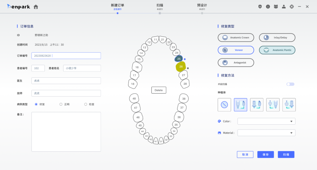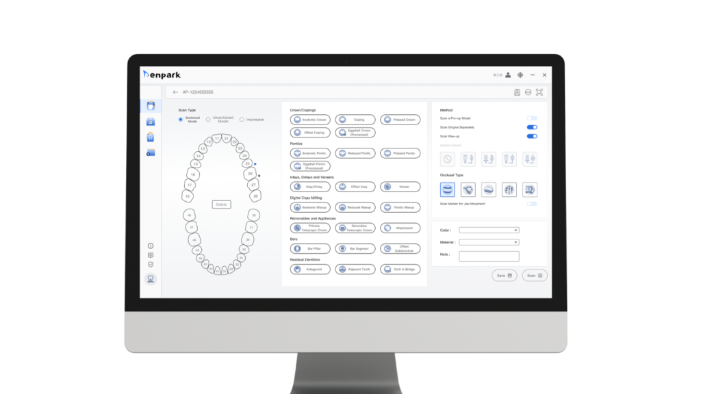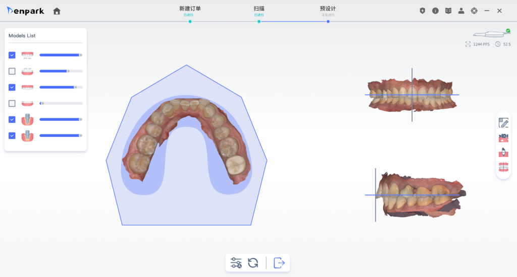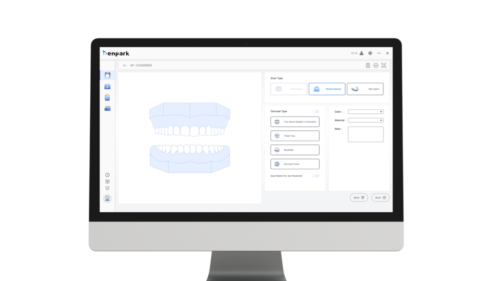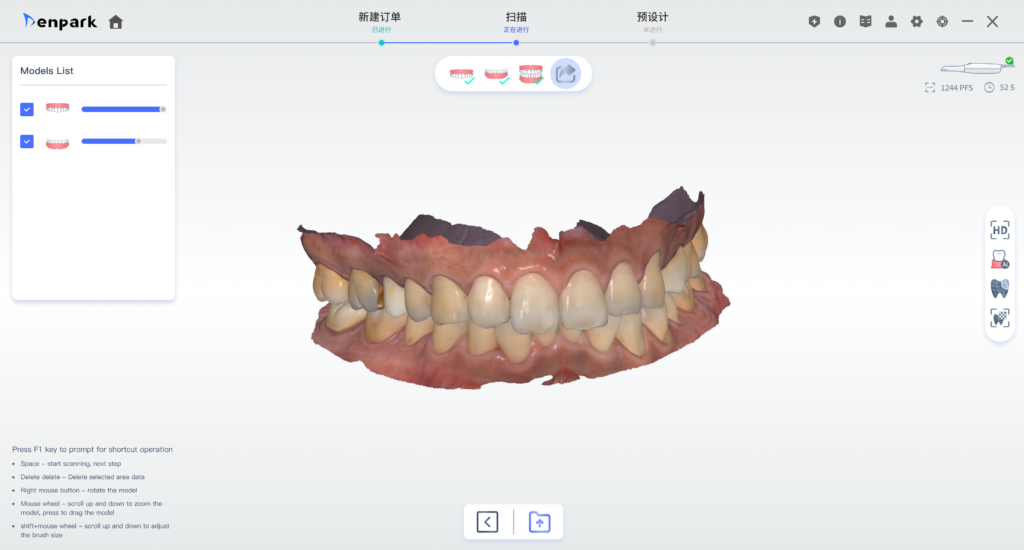 The articulator scanning mode supports multiple types of articulator scanning, supports static and dynamic scanning switching of the articulator, and meets a variety of scanning needs. The dynamic articulator scanning mode scans the entire buccal surface occlusion to improve the accuracy of alignment.